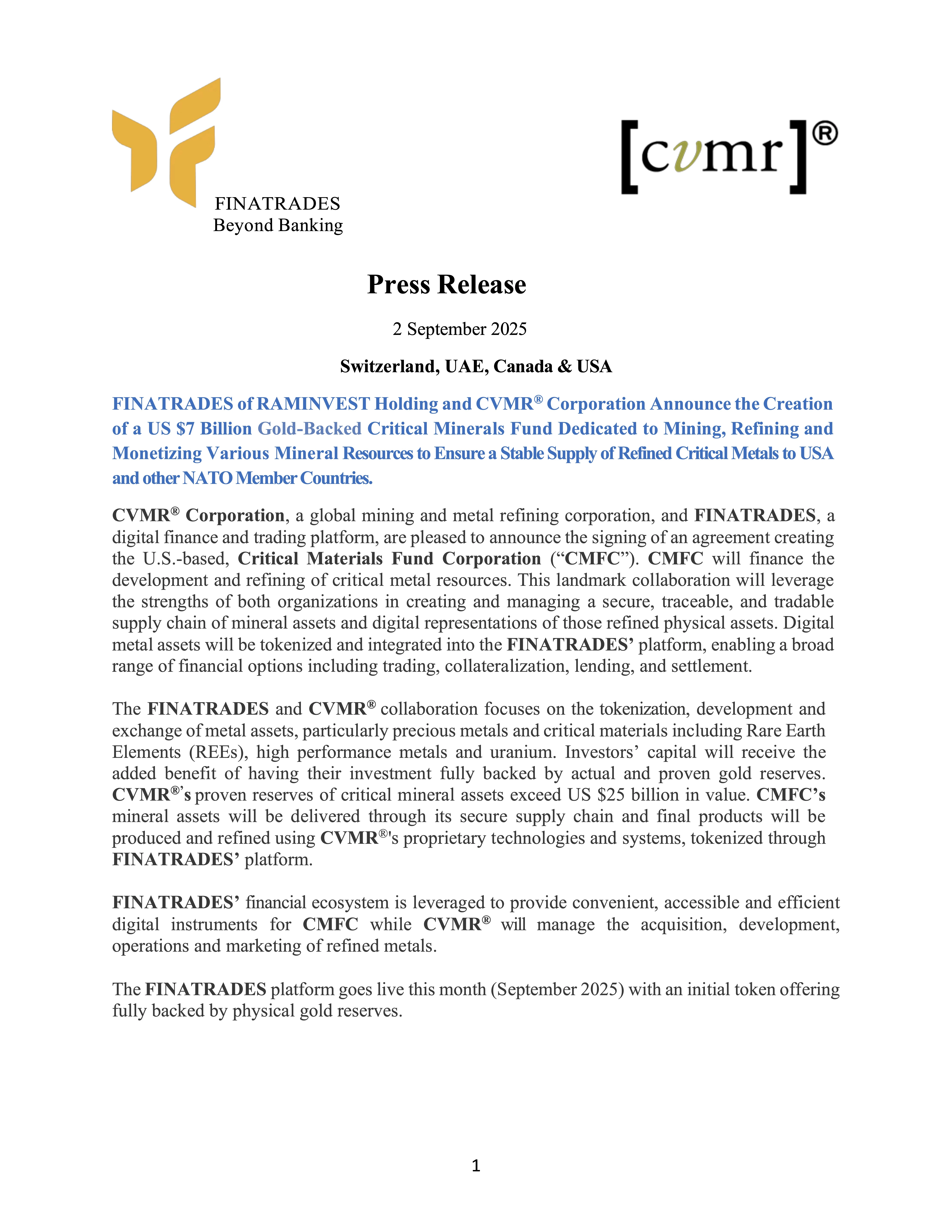 FINATRADES of RAMINVEST Holding and CVMR® Corporation Announce the Creation of a US $7 Billion Gold-Backed Critical Minerals Fund Dedicated to Mining, Refining and Monetizing Various Mineral Resources to Ensure a Stable Supply of Refined Critical Metals to USA and other NATO Member Countries.