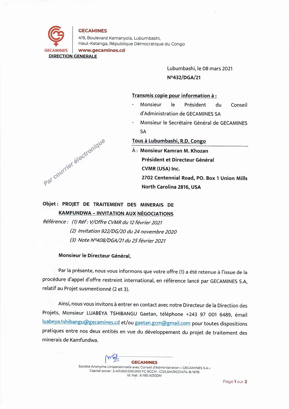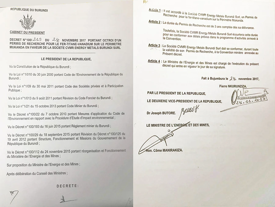 In November 2017 CVMR® entered into a series of agreements with the government of the Republic of Burundi, with their Cabinet approval and Presidential Decree, for the following concessions: Nyabikere, Waga and Mukanda. The concessions have proven and
