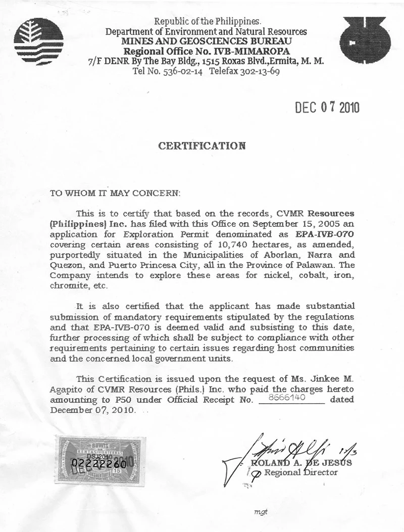 In the Philippines, CVMR® owns concessions in six nickel deposits, on the islands of Palawan and Samar. The properties are located at Narra, Quezon and Arborlan in the Province of Palawan, and at Balangiga, Giporlos and Quinapondan in the Province of
