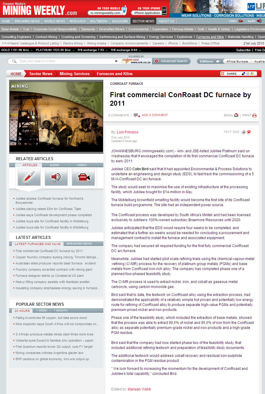 First commercial ConRoast DC furnace by 2011, MINING WEEKLY![]()