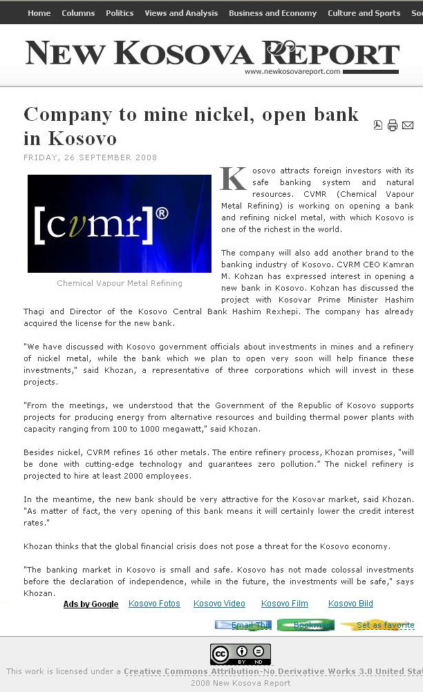 New Kosovo Report - Company to mine nickel, open bank in Kosovo