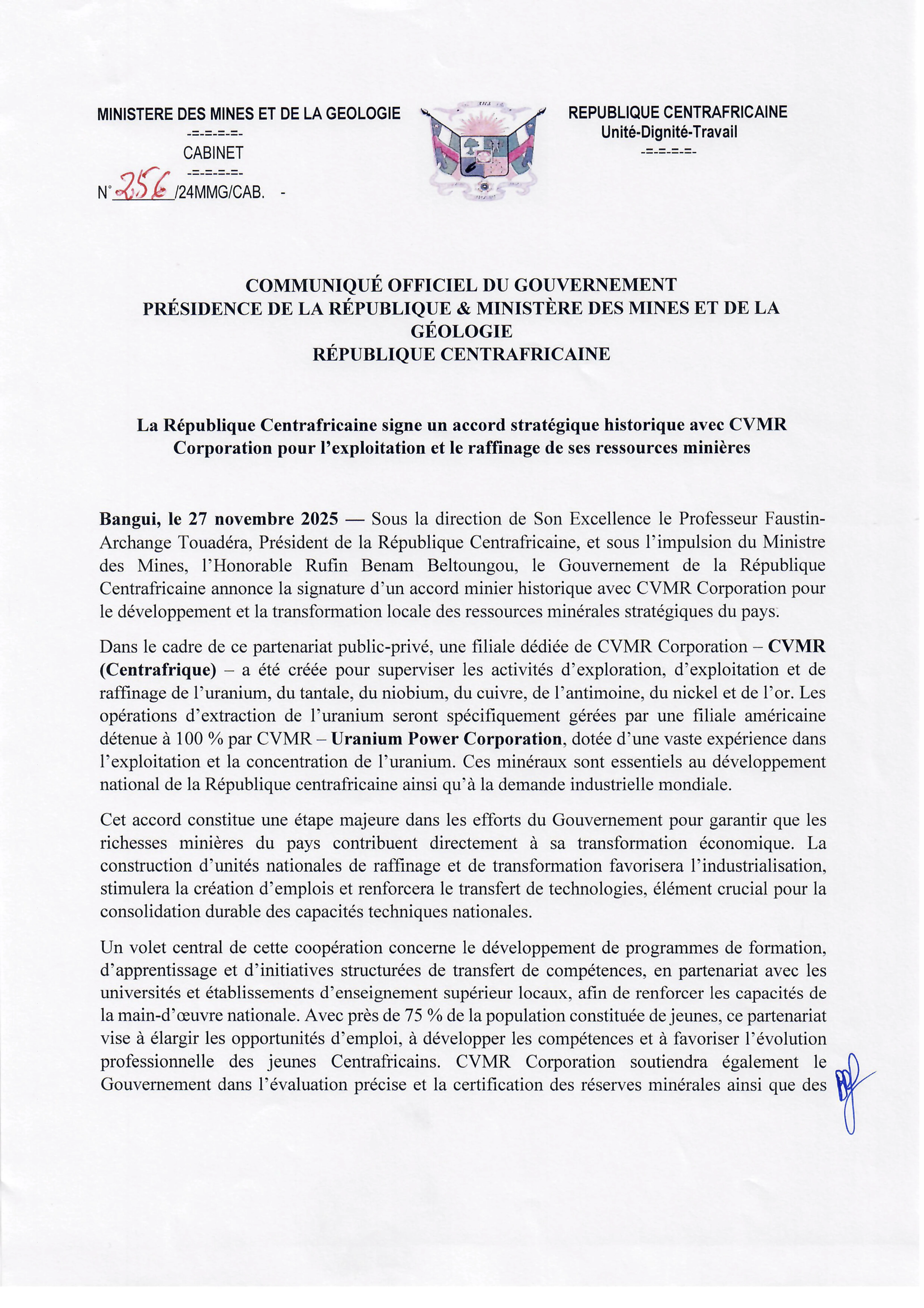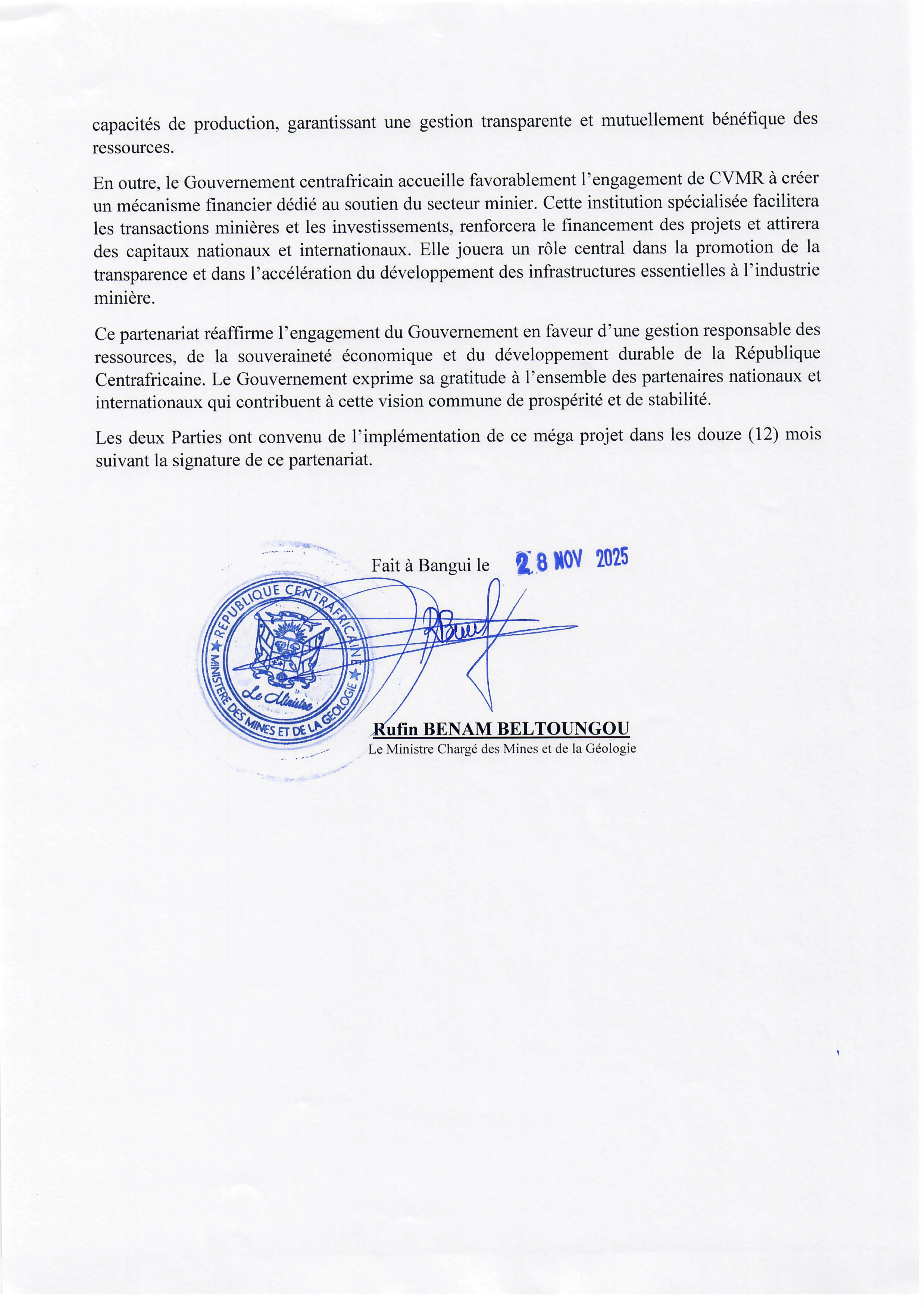 THE CENTRAL AFRICAN REPUBLIC ENTERS A NEW ERA OF MINERAL RESOURCE DEVELOPMENT: HISTORIC MINING PARTNERSHIP SIGNED WITH THE CVMR® GROUP, DRIVEN BY THE VISION OF PRESIDENT TOUADÉRA AND THE EXPERTISE OF MINISTER BENAM